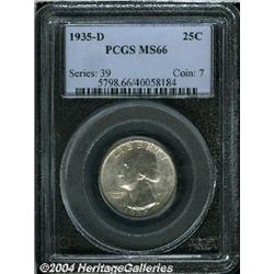 <B>1935-D<25C> MS66 PCGS.</B></I> Lustrous, unmarked surfaces are visited by touches of reddish-brown toning in localized areas. Population: 110 in 66, 9 finer (9/04). <BR><BR><B>Important notice:</B> Heritage usually auctions material at the rate of 200-250 lots per hour. On some occasions eBay Live bid software or the Internet may not be able to keep up with the pace of the auction. We recommend placing a realistic absentee bid now as insurance to avoid disappointment. Occasionally the auctioneer may eliminate or reject an eBay Live bid, and the auctioneer may also reopen a lot after the close of the eBay live bidding (usually because we missed an audience bid), and may reject your bid even if it shows you as the winning bidder. By bidding via eBay Live, you agree that Heritage may award the lot to another bidder at its sole discretion under the circumstances described above or any other reasonable circumstances. Since eBay bids are not shown to us until we open the lot on the floor, we treat those bids just like floor bids. In most cases the floor responds before the eBay bid is presented to us, due to Internet lag time, so for consistency we have made it a policy that floor bids are always considered first over tie eBay live bids. Also please note that all Heritage lots purchased through eBay Live carry a 20% Buyer's Premium. Please make sure you read the Terms and Conditions before you bid.