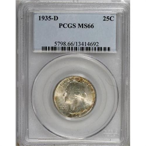 <B>1935-D 25C MS66 PCGS.</B></I> Whispers of attractive olive-green toning exhibit gold-orange and crimson accents. Boldly impressed with bright luster and the great luster often found on high-end examples of this early issue. PCGS has graded 12 finer pieces (8/07).<BR><BR><B>Coin Engraver:</B> John Flanagan<BR><BR><b>Shipping:</b> Coins & Currency (<a target="_blank" href="http://www.heritageauctions.com/common/shipping.php">view shipping information</a>)