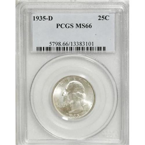 <B>1935-D 25C MS66 PCGS.</B></I> Whispers of olive toning appear at the margins of this otherwise silver-gray piece, satiny and beautifully preserved. A well struck and attractive early D-mint survivor. PCGS has certified 12 finer pieces (12/07).<BR><BR><B>Coin Engraver:</B> John Flanagan<BR><BR><b>Shipping:</b> Coins & Currency (<a target="_blank" href="http://www.heritageauctions.com/common/shipping.php">view shipping information</a>)