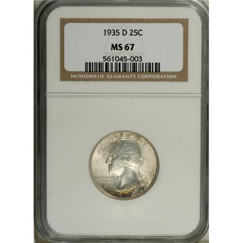 <B>1935-D 25C MS67 NGC.</B></I> This immensely appealing Superb Gem is a semi-key for the series and a modern condition rarity. Solidly struck and highly lustrous with spots of brick-red toning around the letters of LIBERTY and gold and magenta patina near the date. Two tiny marks are noted on the eagle's body. Census: 6 in 67, 0 finer (11/06).<BR><BR><b>Shipping:</b> Coin/Currency (<a target="_blank" href="http://www.heritageauctions.com/common/shipping.php">view shipping information</a>)