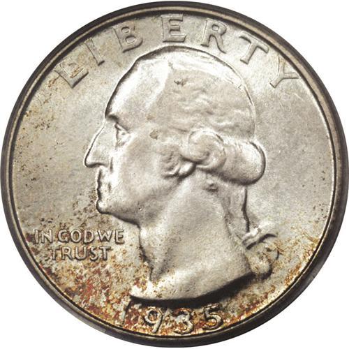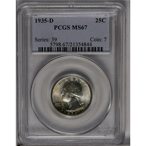 <B>1935-D<25C> MS67 PCGS.</B></I> One of the most difficult issues among early Washington quarters in Gem and better grades. This Superb, creamy-white example displays some mottled blushes of red, gold, and green iridescent toning along the lower portion of the obverse and on the reverse a hint of golden-orange peripheral color. A few pinpoint marks on the eagle's left (facing) leg are mentioned for the sake of accuracy. Population: 12 in 67; none are finer at either service (6/06).
