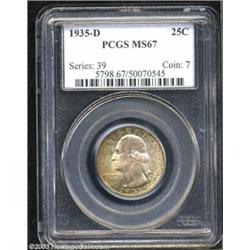 <table><tr><td><TABLE cellSpacing=0 cellPadding=0 width="100%" bgColor=#000000 border=0><TBODY> <TR><TD width="100%"><TABLE cellSpacing=1 cellPadding=3 width="100%" border=0><TBODY><TR><TD width="100%" bgColor=#79735c><FONT face=arial color=#ffffff size=3><B>Description</B> </FONT></TD></TR><TR><TD width="100%" bgColor=#ffffff><FONT face=arial size=2><B>1935-D 25C MS67 PCGS.</B></I> The 1935-D is another scarce, semi-key issue from the Denver mint. Only 5.78 million pieces were produced and high grade examples are very elusive. Only six other pieces have been certified in MS67 by PCGS with none finer at either of the major services (7/03). This is an absolutely splendid coin. The surfaces are covered with light moss-green and rose colored toning around lavender centers, and the whole coin has a significant presence of thick mint frost. As one would expect from the grade, the surfaces approach technical perfection. </FONT></TD></TR></TBODY></TABLE></TD></TR></TBODY></TABLE><BR><A name=PricesRealized></A><TABLE cellSpacing=0 cellPadding=0 width="100%" bgColor=#000000 border=0><TBODY><TR><TD width="100%"><TABLE cellSpacing=1 cellPadding=3 width="100%" border=0><TBODY><TR><TD width="100%" bgColor=#79735c><A name=PR><FONT face=arial color=#ffffff size=3><B>Previous Prices from Heritage Auctions</B> </FONT></A></TD></TR><TR><TD bgColor=#f6f6ed><TABLE cellSpacing=0 cellPadding=0 width="100%" border=1><TBODY><TR><TD align=middle width="33%"><B>Date</B></TD><TD align=middle width="33%"><B>Service</B></TD><TD align=middle width="33%"><B>Price</B></TD></TR><TR bgColor=whitesmoke><TD width="33%"><B>08/08/2001</B></TD><TD width="33%">PCGS</TD><TD width="33%">$5,175.00</TD></TR><TR bgColor=whitesmoke><TD width="33%"><B>09/01/1998</B></TD><TD width="33%">PCGS</TD><TD width="33%">$2,875.00</TD></TR></TBODY></TABLE></TD></TR><TR><TD bgColor=#ffffff><FONT face=arial size=1 ?>PLEASE NOTE: All prices realized reflect the final hammer price PLUS the buyer's premium in auctions that charge a buyer's premium. Each item has a notation at the top of the listing indicating whether that lot included a buyer's premium. Example: A item that sells with a final hammer price of $100 and a 20% buyer's premium will display with a price realized of $120. All information listed is intended to be as accurate as possible, but errors are possible. Please use this guide carefully and inform us of any inaccuracies. </FONT></TD></TR></TBODY></TABLE></TD></TR></TBODY></TABLE><BR><TABLE cellSpacing=0 cellPadding=0 width="100%" bgColor=#000000 border=0><TBODY><TR><TD width="100%"><TABLE cellSpacing=1 cellPadding=3 width="100%" border=0><TBODY><TR><TD width="100%" bgColor=#79735c colSpan=6><FONT face=arial color=#ffffff size=3><B>Price Guide*</B> </FONT></TD></TR><TR bgColor=#f6f6ed><TD align=middle><B>Grade</B> </TD><TD align=middle><B>Coin World<BR>(Trends)</B> </TD><TD align=middle><B>Numismedia<BR>Retail</B> </TD><TD align=middle><B>Numismedia<BR>Wholesale</B> </TD><TD align=middle><B>Coin<BR>Universe</B> </TD><TD align=middle><B>Heritage<BR>Value Index</B> </TD></TR><TR bgColor=#ffffff><TD align=middle>66</TD><TD align=right>---</TD><TD align=right>---</TD><TD align=right>$1,575.00</TD><TD align=right>$2,000.00</TD><TD align=right>$1,137.50</TD></TR><TR style="FONT-WEIGHT: bold" bgColor=#cccfdd><TD align=middle>67</TD><TD align=right>---</TD><TD align=right>---</TD><TD align=right>$3,475.00</TD><TD align=right>$12,500.00</TD><TD align=right>$8,400.00</TD></TR><TR bgColor=#ffffff><TD align=middle>68</TD><TD align=right>---</TD><TD align=right>---</TD><TD align=right>---</TD><TD align=right>---</TD><TD align=right>---</TD></TR><TR bgColor=#ffffff><TD colSpan=6><FONT size=1>*All information listed is intended to be as accurate as possible, but errors are possible. No item may be returned or refused based on this information which is provided as a service to our customers. You should contact each pricing source directly to determine the accuracy of this information. </FONT></TD></TR></TBODY></TABLE></TD></TR></TBODY></TABLE><BR><TABLE cellSpacing=0 cellPadding=0 width="100%" bgColor=#000000 border=0><TBODY><TR><TD width="100%"><TABLE cellSpacing=1 cellPadding=3 width="100%" border=0><TBODY><TR><TD width="100%" bgColor=#79735c><FONT face=arial color=#ffffff size=3><B>Population Guide</B> </FONT></TD></TR><TR bgColor=#ffffff><TD align=middle><!-- Begin Output of Population Grid--><TABLE cellSpacing=0 cellPadding=0 width="100%" border=0><TBODY><TR><TD vAlign=center><TABLE cellSpacing=0 width="100%" border=1 cellsadding="3"><TBODY><TR><TD vAlign=center><TABLE cellSpacing=0 cellPadding=3 width="100%" border=1><TBODY><TR><TD vAlign=center align=middle bgColor=#f0f1e8 colSpan=2 <CENTER><FONT face=Arial size=2><B>PCGS Pop </B></FONT><CENTER></CENTER></TD><TD vAlign=center align=middle bgColor=#f0f1e8 colSpan=2><CENTER><FONT face=Arial size=2><B>NGC Pop</B></CENTER></FONT></TD></TR><TR><TD vAlign=center><FONT face=Arial size=2>(67)</FONT> </TD><TD vAlign=center align=right><FONT face=Arial size=2>8</FONT> </TD><TD vAlign=center><FONT face=Arial size=2>(67)</FONT> </TD><TD vAlign=center align=right><FONT face=Arial size=2>4</FONT> </TD></TR><TR><TD vAlign=center><FONT face=Arial size=2>(>67)</FONT> </TD><TD vAlign=center align=right><FONT face=Arial size=2>0</FONT> </TD><TD vAlign=center><FONT face=Arial size=2>(>67)</FONT> </TD><TD vAlign=center align=right><FONT face=Arial size=2>0</FONT> </TD></TR></TBODY></TABLE></TD></TR></TBODY></TABLE></TD></TR></TBODY></TABLE><!-- End Output of Population Grid--></TD></TR></TBODY></TABLE></TD></TR></TBODY></TABLE><BR><TABLE cellSpacing=0 cellPadding=0 width="100%" bgColor=#000000 border=0><TBODY><TR> Important notice: Heritage usually auctions material at the rate of 200-250 lots per hour. On some occasions eBay Live bid software or the Internet may not be able to keep up with the pace of the auction. We recommend placing a realistic absentee bid now as insurance to avoid disappointment. Occasionally