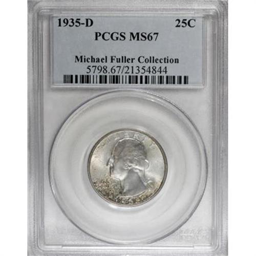 <B>1935-D 25C MS67 PCGS.</B></I> One of the most difficult issues among early Washington quarters in Gem and better grades. This Superb, creamy-white example displays magnificent luster and some mottled blushes of red, gold, and green iridescent toning along the lower portion of the obverse and on the reverse a hint of golden-orange peripheral color. A few pinpoint marks on the eagle's left (facing) leg are mentioned for the sake of accuracy. Population: 12 in 67; none are finer at either service (10/07).<BR><I>From The Michael Fuller Collection.</B></I><BR><BR><B>Coin Engraver:</B> John Flanagan<BR><BR><b>Shipping:</b> Coins & Currency (<a target="_blank" href="http://www.heritageauctions.com/common/shipping.php">view shipping information</a>)