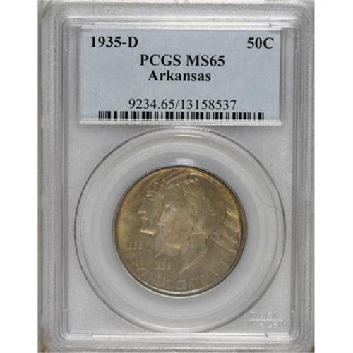 <B>1935-D 50C Arkansas MS65 PCGS.</B></I> PCGS Population (386/233). NGC Census: (312/116). Mintage: 5,505. Numismedia Wsl. Price for NGC/PCGS coin in MS65: $200. (#9234)<BR><BR><b>Shipping:</b> Coins & Currency (<a target="_blank" href="http://www.heritageauctions.com/common/shipping.php">view shipping information</a>)