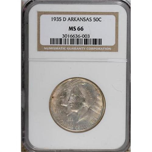 <B>1935-D 50C Arkansas MS66 NGC.</B></I> NGC Census: (94/24). PCGS Population (199/37). Mintage: 5,505. Numismedia Wsl. Price for NGC/PCGS coin in MS66: $675. (#9234)<BR><BR><b>Shipping:</b> Coins & Currency (<a target="_blank" href="http://www.heritageauctions.com/common/shipping.php">view shipping information</a>)