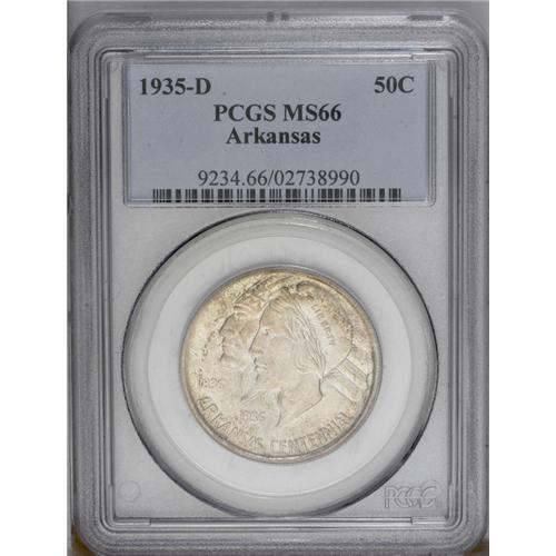 <B>1935-D 50C Arkansas MS66 PCGS.</B></I> Excellent luster radiates through light golden-tan patina, and the design features are sharply impressed, except for the usual softness on the eagle's neck feathers. Both sides are well preserved. Population: 182 in 66, 34 finer (1/06).