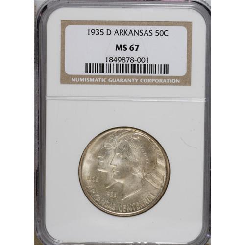<B>1935-D 50C Arkansas MS67 NGC.</B></I> A remarkably clean example of this classic commemorative issue. The satiny obverse is silver-gray, though a touch of golden-brown graces the reverse. NGC has certified only one numerically finer coin (2/07).<BR><BR><b>Shipping:</b> Coins & Currency (<a target="_blank" href="http://www.heritageauctions.com/common/shipping.php">view shipping information</a>)