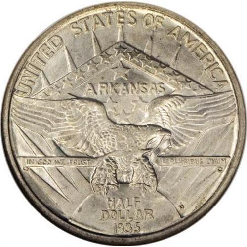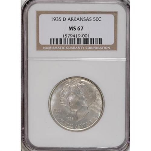 <B>1935-D 50C Arkansas MS67 NGC.</B></I> Faint golden-tan and ice-blue patina covers radiantly lustrous surfaces. A well executed strike complements these attributes by leaving sharp definition on the design elements. As expected from the designated grade, this is a wonderfully preserved example. Census: 24 in 67, 1 finer (12/07).<BR><BR><b>Shipping:</b> Coins & Currency (<a target="_blank" href="http://www.heritageauctions.com/common/shipping.php">view shipping information</a>)