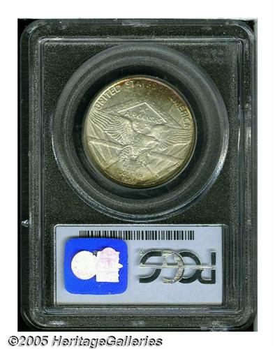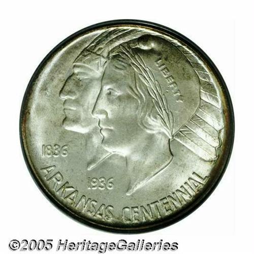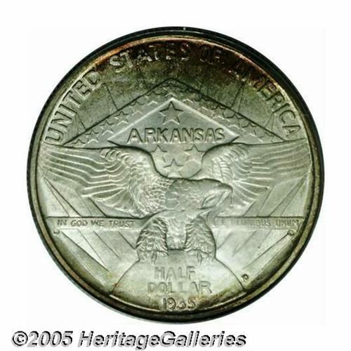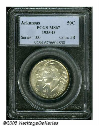 <B>1935-D<50C> Arkansas MS67 PCGS.</B></I> An outstanding example of this conditionally rare commemorative. Even argent-gray patina of light density overlays both sides with a smidgen of brick-red color at the top of the reverse. The faces are clean and untroubled by coin-to-coin contact. Population: 30 in 67, 0 finer (3/05).
