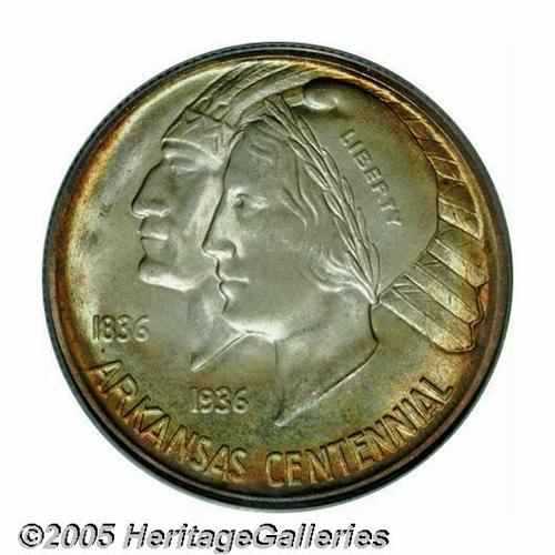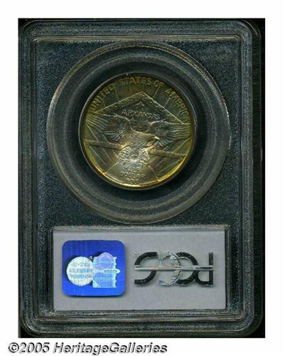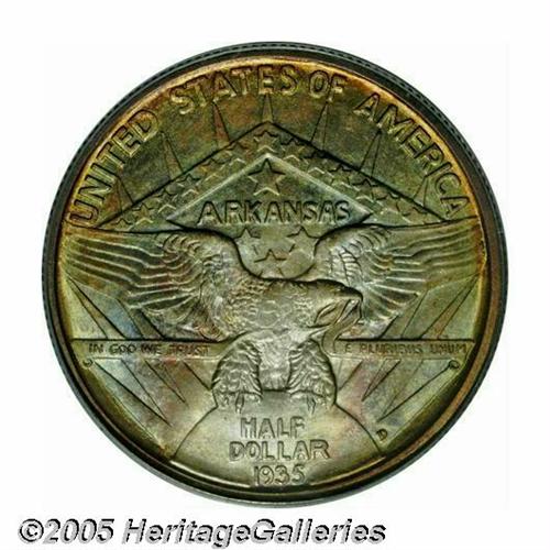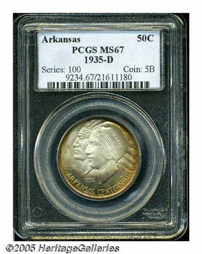 <B>1935-D<50C> Arkansas MS67 PCGS.</B></I> Lavish orange-gold and lime-green colors caress the borders of this lustrous Superb Gem. Not quite completely brought up on the eagle's breast, but the strike is generally sharp. The reverse is especially well preserved. Just 5,505 pieces were struck for the first Denver issue of the five year Arkansas type. Population: 30 in 67, 0 finer (4/05).