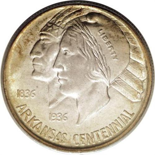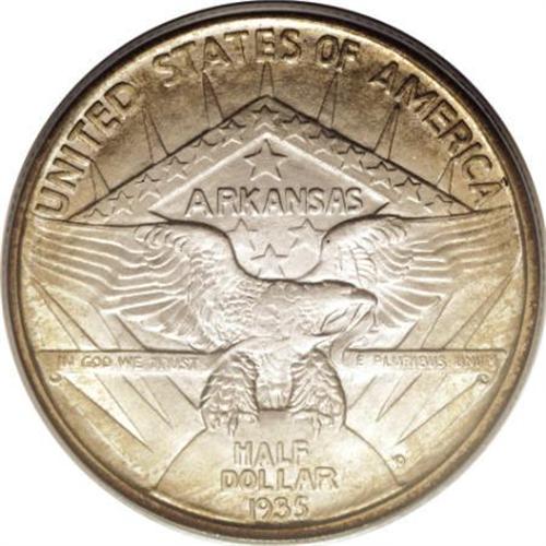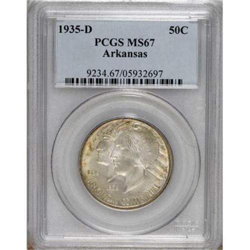 <B>1935-D 50C Arkansas MS67 PCGS.</B></I> One of just 5,505 pieces struck for this first-year branch mint issue, this carefully preserved example displays subtle golden-tan patina at the margins and satiny silver-gray color in the centers. Better-defined than usual, particularly on the portraits, with uncharacteristically strong eye appeal. Tied for the finest certified by PCGS (5/07).<BR><BR><b>Shipping:</b> Coins & Currency (<a target="_blank" href="http://www.heritageauctions.com/common/shipping.php">view shipping information</a>)