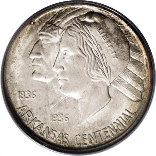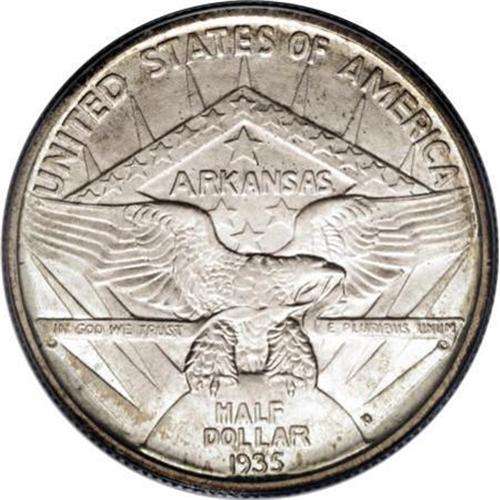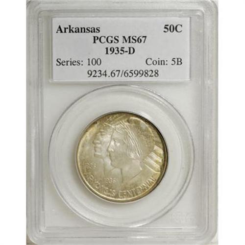 <B>1935-D 50C Arkansas MS67 PCGS.</B></I> The cream-gray toning gradually deepens to olive-gold toward the rims. This satiny and precisely struck Superb Gem has exceptional eye appeal, and would provide an outstanding contribution to a Registry Set of classic silver commemoratives. Population: 37 in 67, 0 finer (8/07).<BR><I>From The Sterling Collection.</B></I><BR><BR><b>Shipping:</b> Coins & Currency (<a target="_blank" href="http://www.heritageauctions.com/common/shipping.php">view shipping information</a>)
