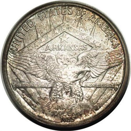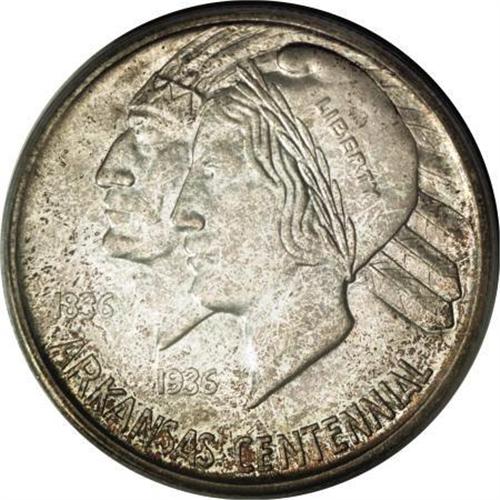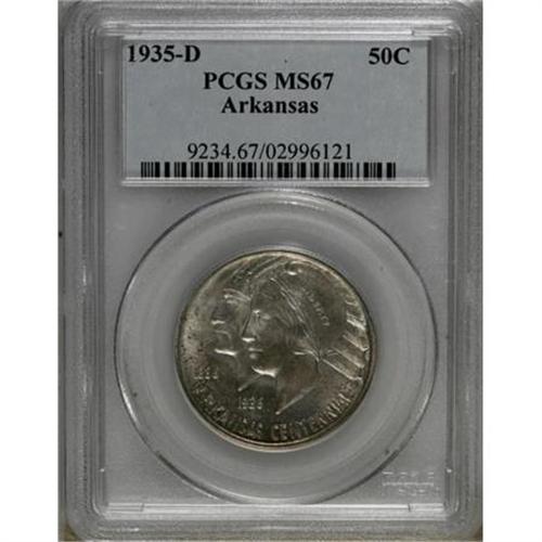 <B>1935-D 50C Arkansas MS67 PCGS.</B></I> Dapples of reddish-gold and olive-green race over the lustrous surfaces of this Superb Gem commemorative, and an attentive strike brings up the intricate details of the design features. Refreshingly devoid of mentionable contact marks. Population: 37 in 67, 0 finer (3/08).<BR><BR><b>Shipping:</b> Coins & Currency (<a target="_blank" href="http://www.heritageauctions.com/common/shipping.php">view shipping information</a>)