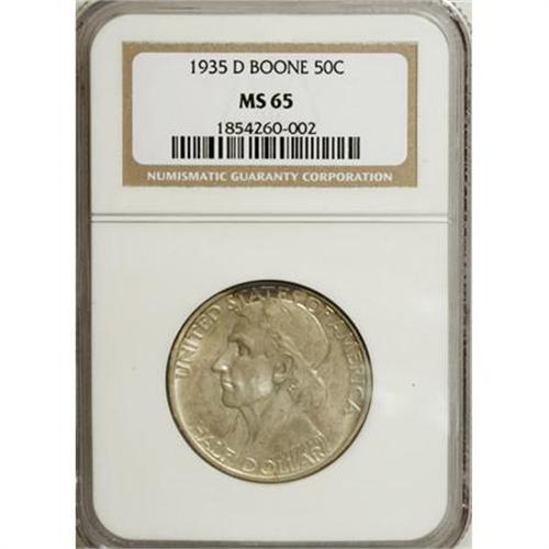<B>1935-D 50C Boone MS65 NGC.</B></I> NGC Census: (209/79). PCGS Population (273/85). Mintage: 5,005. Numismedia Wsl. Price for NGC/PCGS coin in MS65: $228. (#9259)<BR><I>From The Frank DuVall Collection of U.S. Commemoratives.</B></I><BR><BR><b>Shipping:</b> Coins & Currency (<a target="_blank" href="http://www.heritageauctions.com/common/shipping.php">view shipping information</a>\)