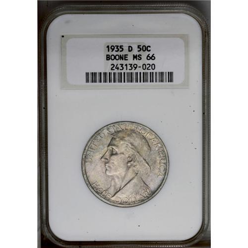 <B>1935-D<50C> Boone MS66 NGC.</B></I> Subtle mauve, violet, and gold color patterns bathe radiantly lustrous surfaces that exhibit sharply struck design elements. A few minute marks on the obverse cheek are mentioned for accuracy. Census: 82 in 66, 4 finer (2/06). <BR><BR><B>Important notice:</B> Heritage usually auctions material at the rate of 200-250 lots per hour. On some occasions eBay Live bid software or the Internet may not be able to keep up with the pace of the auction. We recommend placing a realistic absentee bid now as insurance to avoid disappointment. Occasionally the auctioneer may eliminate or reject an eBay Live bid, and the auctioneer may also reopen a lot after the close of the eBay live bidding (usually because we missed an audience bid), and may reject your bid even if it shows you as the winning bidder. By bidding via eBay Live, you agree that Heritage may award the lot to another bidder at its sole discretion under the circumstances described above or any other reasonable circumstances. Since eBay bids are not shown to us until we open the lot on the floor, we treat those bids just like floor bids. In most cases the floor responds before the eBay bid is presented to us, due to Internet lag time, so for consistency we have made it a policy that floor bids are always considered first over tie eBay live bids. Also please note that all Heritage lots purchased through eBay Live carry a 20% Buyer's Premium. Please make sure you read the Terms and Conditions before you bid. This lot is being auctioned in conjunction with a live floor auction by Heritage Galleries & Auctioneers. All final auction and invoice information will be supplied by Heritage Galleries & Auctioneers, and all other information should be considered preliminary. Lot:4872 <BR><BR><B>Winning Notification and Billing:</B> After the FINAL session in this auction is complete, Heritage will send e-mail and snail mail invoices. This process normally takes several days. All final auction and invoice information will be supplied by Heritage Galleries & Auctioneers, and all other information should be considered preliminary. <BR><BR>This auction will be conducted on a live auction floor and over the Internet through eBay Live. If you choose to place an absentee bid, please take a moment to <font color='#0000ff'><u><a href='http://pages.ebay.com/liveauctions/help/before/laabsentee.html'>learn how eBay Live absentee bidding works</a></u></font><font color='#000000'>