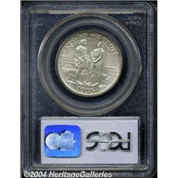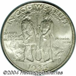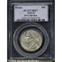 <B>1935-D<50C> Boone MS67 PCGS.</B></I> Two different varieties of Boone half dollars were issued in 1935. The modification of design was the addition of the 1934 date in small digits in the reverse field. Each of the two designs were struck at all three mints, thus providing collectors a total of six different coins to acquire. This example is the plain variety produced earlier in the year. A Superb satin Gem with lovely ivory coloration and hints of deep gold along the obverse border. Population: 5 in 67, 0 finer (6/04).<BR><I>From the JFS Collection, the #1 All-Time PCGS Registry Set.</B></I> <BR><BR><B>Important notice:</B> Heritage usually auctions material at the rate of 200-250 lots per hour. On some occasions eBay Live bid software or the Internet may not be able to keep up with the pace of the auction. We recommend placing a realistic absentee bid now as insurance to avoid disappointment. Occasionally the auctioneer may eliminate or reject an eBay Live bid, and the auctioneer may also reopen a lot after the close of the eBay live bidding (usually because we missed an audience bid), and may reject your bid even if it shows you as the winning bidder. By bidding via eBay Live, you agree that Heritage may award the lot to another bidder at its sole discretion under the circumstances described above or any other reasonable circumstances. Since eBay bids are not shown to us until we open the lot on the floor, we treat those bids just like floor bids. In most cases the floor responds before the eBay bid is presented to us, due to Internet lag time, so for consistency we have made it a policy that floor bids are always considered first over tie eBay live bids. Also please note that all Heritage lots purchased through eBay Live carry a 20% Buyer's Premium. Please make sure you read the Terms and Conditions before you bid. </span></font></tr></table></td></tr></table>