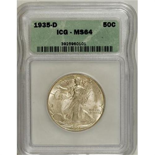 <B>1935-D 50C MS64 ICG.</B></I> NGC Census: (387/160). PCGS Population (543/482). Mintage: 3,003,800. Numismedia Wsl. Price for NGC/PCGS coin in MS64: $344. (#6596)<BR><BR><B>Coin Engraver:</B> Adolph A. Weinman<BR><BR><b>Shipping:</b> Coins & Currency (<a target="_blank" href="http://www.heritageauctions.com/common/shipping.php">view shipping information</a>)