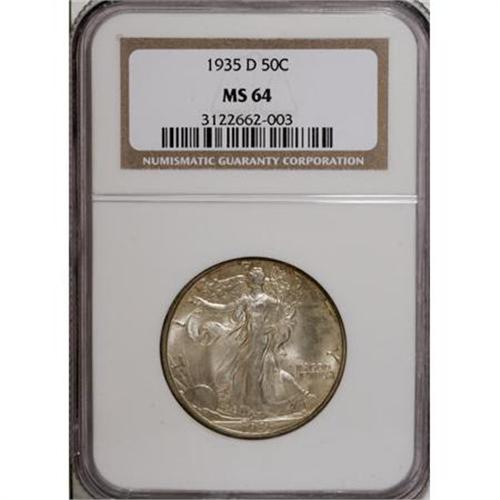 <B>1935-D 50C MS64 NGC.</B></I> . NGC Census: (398/163). PCGS Population (570/514). Mintage: 3,003,800. Numismedia Wsl. Price for NGC/PCGS coin in MS64: $344. (#6596)<BR><BR><B>Coin Engraver:</B> Adolph A. Weinman<BR><BR><b>Shipping:</b> Coins & Currency (<a target="_blank" href="http://www.heritageauctions.com/common/shipping.php">view shipping information</a>)