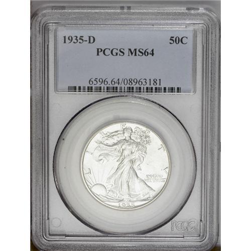 <B>1935-D<50C> MS64 PCGS.</B></I> A wonderful Choice Mint State example of the date with brilliant obverse and reverse surfaces. Both sides have satiny luster with faint reflectivity in the fields. Although Liberty's head and hand are each a bit weak, this example can still be classified as sharply struck for the date.