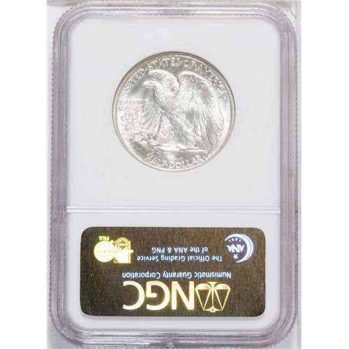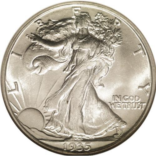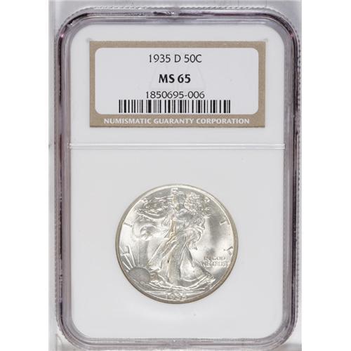 <B>1935-D<50C> MS65 NGC.</B></I> Delicate apricot toning illuminates the obverse, though the reverse remains fully brilliant. This smooth Gem displays booming luster, and perhaps is limited in grade only by a typical impression on the highpoints of Liberty. The 1935-D has a low production of 3,003,800 pieces, and is rarely encountered any finer. As of (6/06), NGC has certified just seven pieces above MS65.
