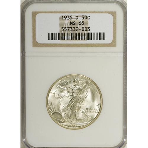 <B>1935-D 50C MS65 NGC.</B></I> Light golden patina graces parts of the frosty obverse. While Liberty's branch hand exhibits only slight definition, the strike is above-average overall. NGC has graded just six coins finer (1/07).<BR><BR><b>Shipping:</b> Coins & Currency (<a target="_blank" href="http://www.heritageauctions.com/common/shipping.php">view shipping information</a>)