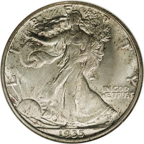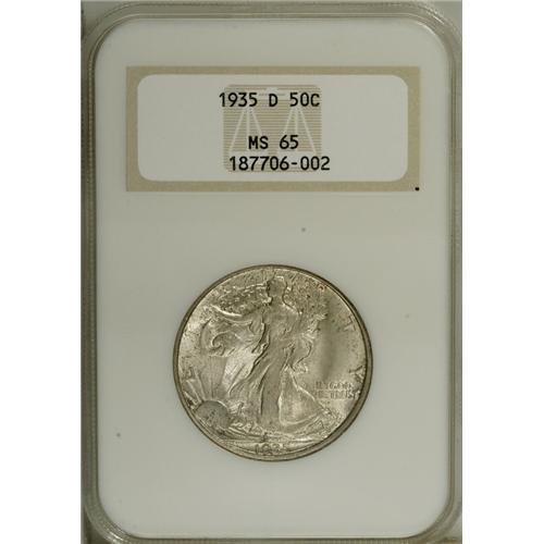 <B>1935-D 50C MS65 NGC.</B></I> Rich powder-blue and chestnut hues embrace this lustrous and carefully preserved Walking Liberty half. The strike is good, although the branch hand, as always, shows minor blending of detail. Encased in an older generation holder. A popular date with a mintage just above 3 million pieces.<BR><BR><b>Shipping:</b> Coin/Currency (<a target="_blank" href="http://www.heritageauctions.com/common/shipping.php">view shipping information</a>)