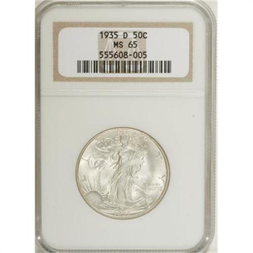 <B>1935-D 50C MS65 NGC.</B></I> A lovely satin finish over each side accents the pleasing alabaster surfaces of this Gem example. Typical striking softness occurs on Liberty's head and branch hand, but the piece is well preserved and free of all but the most minuscule marks. NGC has graded just six pieces finer, as of (5/07). <BR><I>From The Vanek Collection.</B></I><BR><BR><b>Shipping:</b> Coins & Currency (<a target="_blank" href="http://www.heritageauctions.com/common/shipping.php">view shipping information</a>)