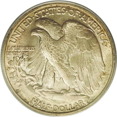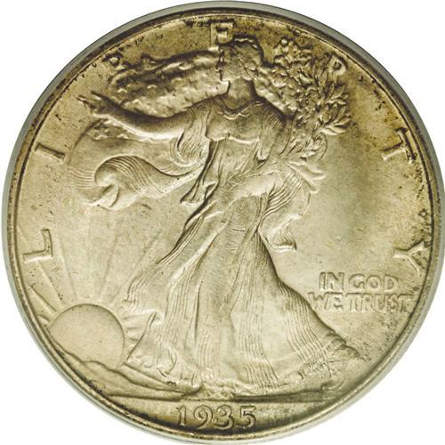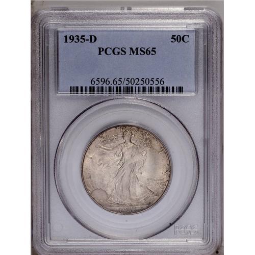 <B>1935-D<50C> MS65 PCGS.</B></I> An impressive Gem with frosty luster beneath pale golden-brown and iridescent toning. Typical for the issue are poorly defined central obverse and reverse design elements. This is a pleasing example of the issue.