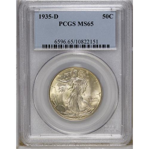 <B>1935-D 50C MS65 PCGS.</B></I> Golden patina drapes the luminous surfaces of this well struck Gem. Several ticks are present on the central obverse devices and in the fields.<BR><BR><b>Shipping:</b> Coin/Currency (<a target="_blank" href="http://www.heritageauctions.com/common/shipping.php">view shipping information</a>)