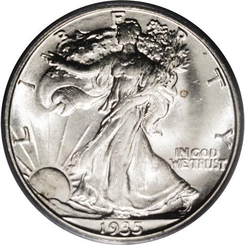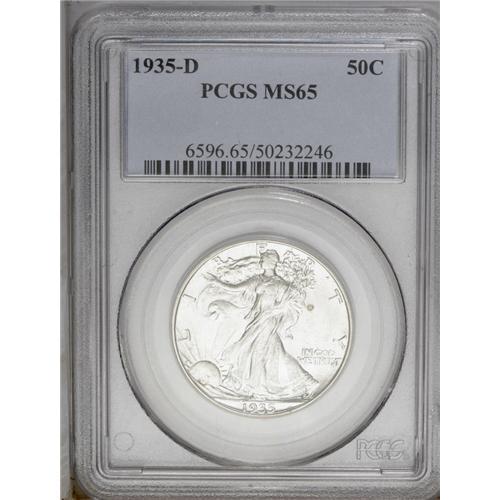 <B>1935-D<50C> MS65 PCGS.</B></I> Lustrous and sharply struck with bright untoned surfaces that only show a few tiny blemishes on either side. A small, circular, reddish toning spot is noted in the upper right obverse field. A flashy and attractive Gem.
