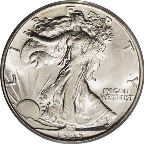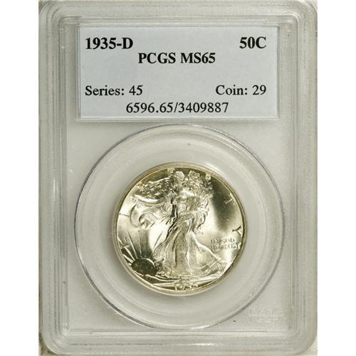 <B>1935-D 50C MS65 PCGS.</B></I> One of the early and unrecognized keys to the 1934-47 series, the 1935-D in Gem condition or better has actually seen only about half the number of specimens graded at PCGS as of the vaunted key-date 1938-D. The present Gem specimen shows a bit of strike bluntness on Liberty's head and branch hand, but the exuberant luster radiating from frosty silver-white surfaces more than compensates. A pretty coin, and difficult to obtain finer.<BR><BR><b>Shipping:</b> Coin/Currency (<a target="_blank" href="http://www.heritageauctions.com/common/shipping.php">view shipping information</a>)