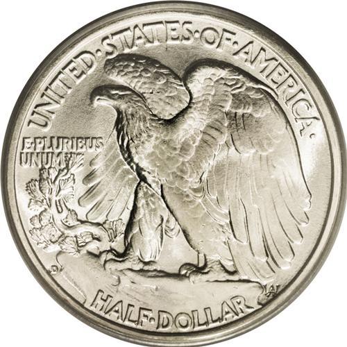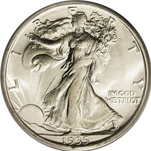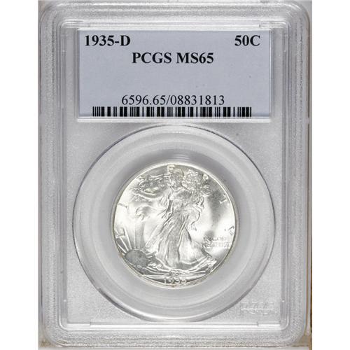 <B>1935-D<50C> MS65 PCGS.</B></I> The superior luster on this untoned coin accounts for the Gem grade, although the central strike is less than full, resulting in flatness on Liberty's head and hand. The eye appeal is high, however, and only minor marks are seen even under a loupe.