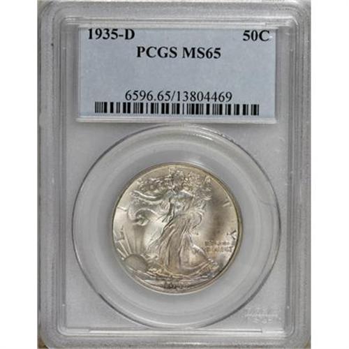 <B>1935-D 50C MS65 PCGS.</B></I> A lovely Gem representative of this Depression-era D-mint issue, well struck with slight definition on Liberty's branch hand. The satiny, shimmering surfaces have ice-blue and champagne patina on each side, and an area of peach toning is present in the right obverse field.<BR><BR><B>Coin Engraver:</B> Adolph A. Weinman<BR><BR><b>Shipping:</b> Coins & Currency (<a target="_blank" href="http://www.heritageauctions.com/common/shipping.php">view shipping information</a>\)
