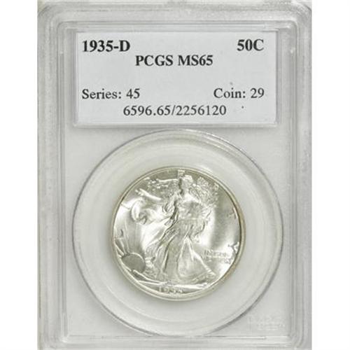 <B>1935-D 50C MS65 PCGS.</B></I> Shimmering luster highlights the beautiful design features and untoned silver surfaces. Above-average on definition, if slightly weak on Liberty's branch hand and hip, and on the eagle's right (facing) leg. A handful of tiny, wispy flaws in the fields are consistent with the grade.<BR><BR><B>Coin Engraver:</B> Adolph A. Weinman<BR><BR><b>Shipping:</b> Coins & Currency (<a target="_blank" href="http://www.heritageauctions.com/common/shipping.php">view shipping information</a>)