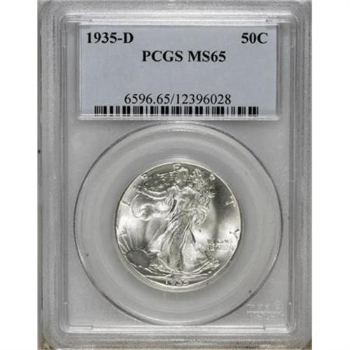 <B>1935-D 50C MS65 PCGS.</B></I> Strong, swirling luster is the prime attribute of this attractive D-mint Walker. Minimally toned with a modicum of definition on Liberty's branch hand. PCGS has graded 83 finer pieces (2/08).<BR><BR><B>Coin Engraver:</B> Adolph A. Weinman<BR><BR><b>Shipping:</b> Coins & Currency (<a target="_blank" href="http://www.heritageauctions.com/common/shipping.php">view shipping information</a>)