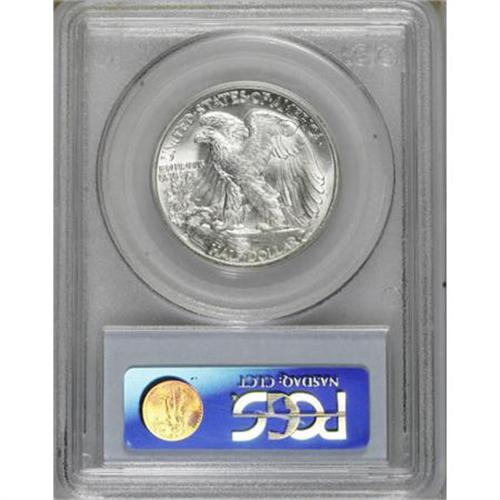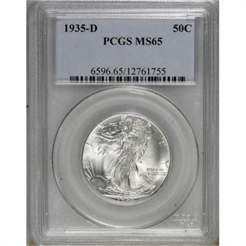 <B>1935-D 50C MS65 PCGS.</B></I> Swirling luster enlivens the silver-blue surfaces of this captivating Gem. Excellent preservation overall, though Liberty's branch hand shows typical softness.<BR><BR><B>Coin Engraver:</B> Adolph A. Weinman<BR><BR><b>Shipping:</b> Coins & Currency (<a target="_blank" href="http://www.heritageauctions.com/common/shipping.php">view shipping information</a>)