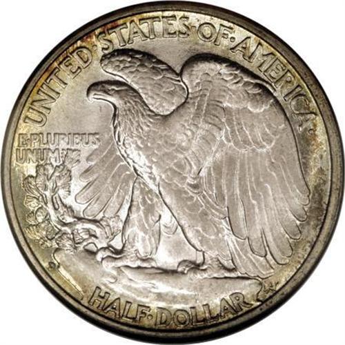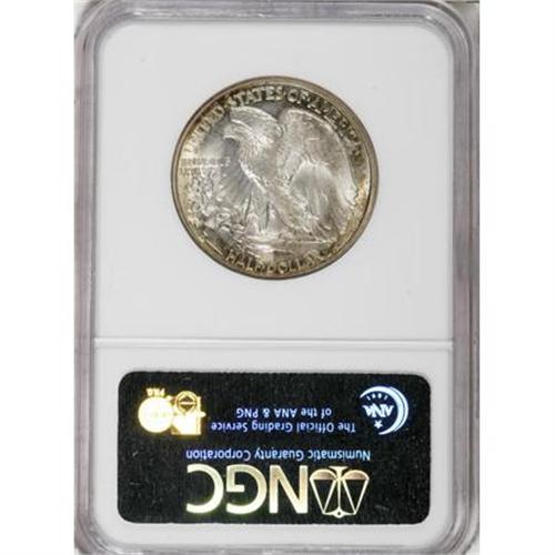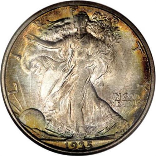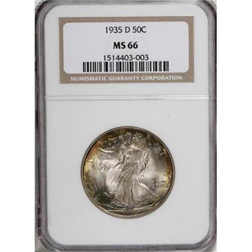 <B>1935-D 50C MS66 NGC.</B></I> Typically struck with strong satin luster and visually alluring coloration, especially on the obverse where rose-gray centers yield to mint-green and amber-red peripheral iridescence. The well preserved surfaces of this Premium Gem Walker are entirely blemish-free, even when inspected closely with a glass. Census: 6 in 66, 0 finer (6/07). <BR><BR><B>Coin Engraver:</B> Adolph A. Weinman<BR><BR><b>Shipping:</b> Coins & Currency (<a target="_blank" href="http://www.heritageauctions.com/common/shipping.php">view shipping information</a>\)