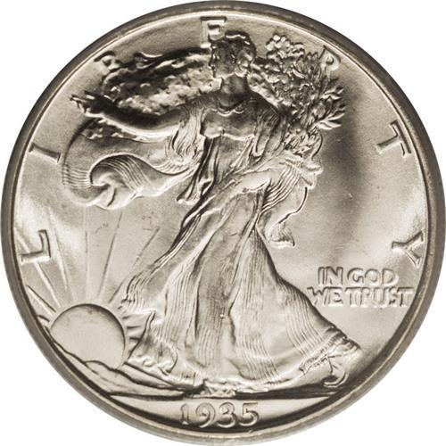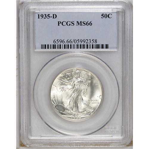<B>1935-D 50C MS66 PCGS.</B></I> This is a notoriously poorly-produced issue, about which expert Anthony Swiatek (1983) has said: "Only God knows if he created Miss Liberty with a fully struck head at the Denver Mint in 1935. He alone would also know her location today." The current offering does show some weakness on Liberty's head and branch hand, but is generally well struck for the date. Rich mint frost and a shining, brilliant appearance ensure the eye appeal of the piece. A couple of minuscule marks are noted on each side, but magnification is needed in order to see them. Population: 74 in 66, 0 finer at either service (11/06).<BR><BR><b>Shipping:</b> Coin/Currency (<a target="_blank" href="http://www.heritageauctions.com/common/shipping.php">view shipping information</a>)