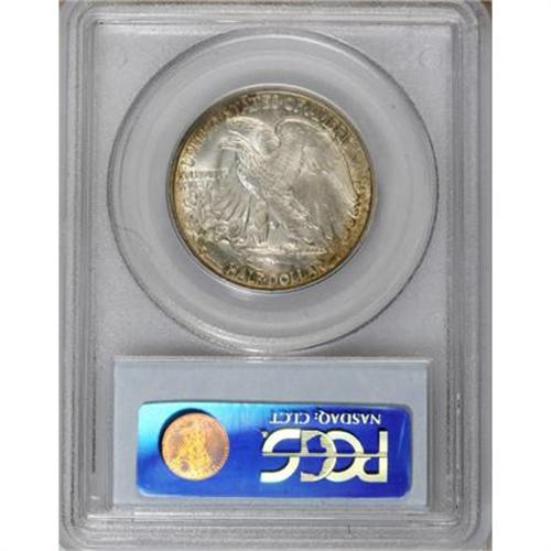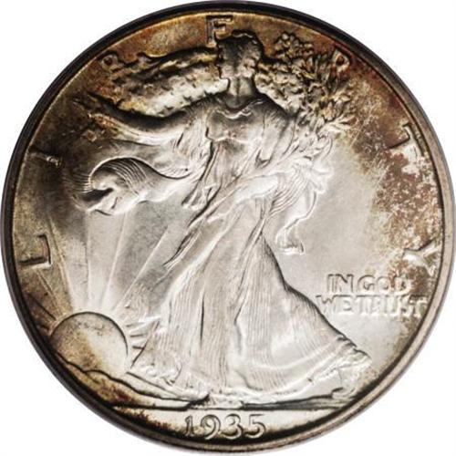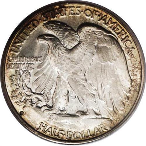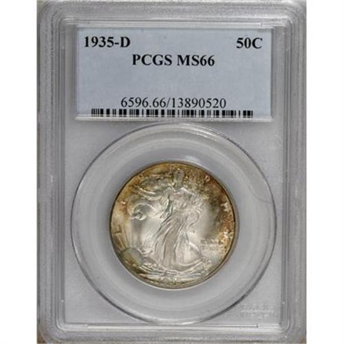 <B>1935-D 50C MS66 PCGS.</B></I> This lovely Premium Gem is tied for the finest certified by either NGC or PCGS. It has frosty luster with full mint brilliance that is only interrupted by light peripheral gold and iridescent toning on each side. It is sharply detailed, except for weakness at Liberty's head and thumb, typical for this issue. Population: 77 in 66, 0 finer (6/07).<BR><BR><b>Shipping:</b> Coins & Currency (<a target="_blank" href="http://www.heritageauctions.com/common/shipping.php">view shipping information</a>)