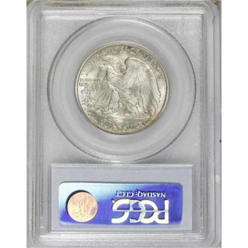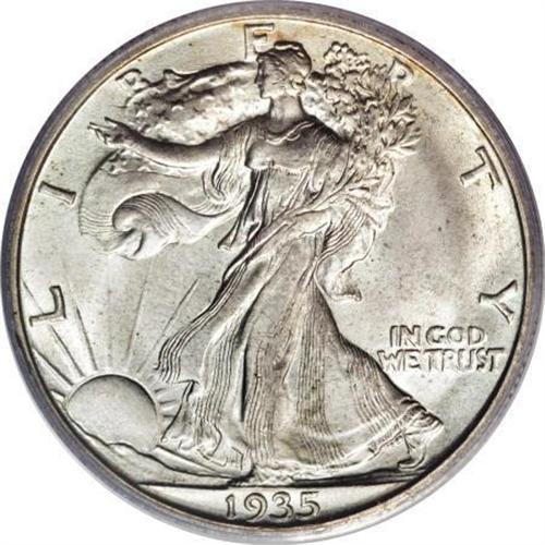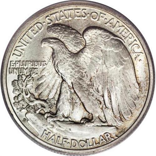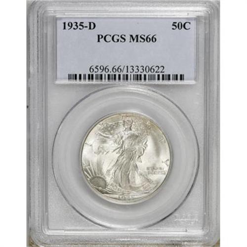 <B>1935-D 50C MS66 PCGS.</B></I> The 1935-D is an issue that is available up to Gem levels, but seldom seen finer. As of (1/08), NGC and PCGS combined have certified only a few dozen pieces in MS66, with none finer at either service. Charcoal-gray accents cover each side of this delightful Premium Gem. <BR><BR><B>Coin Engraver:</B> Adolph A. Weinman<BR><BR><b>Shipping:</b> Coins & Currency (<a target="_blank" href="http://www.heritageauctions.com/common/shipping.php">view shipping information</a>)