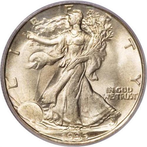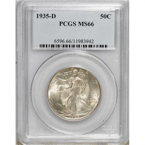 <B>1935-D 50C MS66 PCGS.</B></I> Sun-gold toning drapes this lustrous and remarkably unabraded Premium Gem. A crisp strike with minor incompleteness on the central skirt lines. Only about 3 million pieces were struck, and few rolls were saved. Neither PCGS nor NGC have certified any finer (1/08).<BR><BR><B>Coin Engraver:</B> Adolph A. Weinman<BR><BR><b>Shipping:</b> Coins & Currency (<a target="_blank" href="http://www.heritageauctions.com/common/shipping.php">view shipping information</a>)