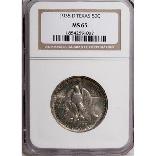 <B>1935-D 50C Texas MS65 NGC.</B></I> NGC Census: (423/815). PCGS Population (820/802). Mintage: 10,007. Numismedia Wsl. Price for NGC/PCGS coin in MS65: $292. (#9383)<BR><I>From The Frank DuVall Collection of U.S. Commemoratives.</B></I><BR><BR><b>Shipping:</b> Coins & Currency (<a target="_blank" href="http://www.heritageauctions.com/common/shipping.php">view shipping information</a>\)