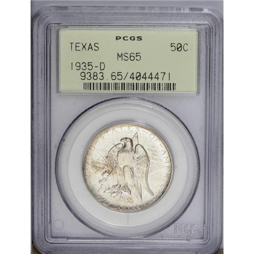 <B>1935-D<50C> Texas MS65 PCGS.</B></I> Mostly white with a touch of sienna color on the obverse and semi-prooflike fields. Encased in a first-generation PCGS holder. <BR><BR><B>Important notice:</B> Heritage usually auctions material at the rate of 200-250 lots per hour. On some occasions eBay Live bid software or the Internet may not be able to keep up with the pace of the auction. We recommend placing a realistic absentee bid now as insurance to avoid disappointment. Occasionally the auctioneer may eliminate or reject an eBay Live bid, and the auctioneer may also reopen a lot after the close of the eBay live bidding (usually because we missed an audience bid), and may reject your bid even if it shows you as the winning bidder. By bidding via eBay Live, you agree that Heritage may award the lot to another bidder at its sole discretion under the circumstances described above or any other reasonable circumstances. Since eBay bids are not shown to us until we open the lot on the floor, we treat those bids just like floor bids. In most cases the floor responds before the eBay bid is presented to us, due to Internet lag time, so for consistency we have made it a policy that floor bids are always considered first over tie eBay live bids. Also please note that all Heritage lots purchased through eBay Live carry a 20% Buyer's Premium. Please make sure you read the Terms and Conditions before you bid. This lot is being auctioned in conjunction with a live floor auction by Heritage Galleries & Auctioneers. All final auction and invoice information will be supplied by Heritage Galleries & Auctioneers, and all other information should be considered preliminary. Lot:5095 <BR><BR><B>Winning Notification and Billing:</B> After the FINAL session in this auction is complete, Heritage will send e-mail and snail mail invoices. This process normally takes several days. All final auction and invoice information will be supplied by Heritage Galleries & Auctioneers, and all other information should be considered preliminary. <BR><BR>This auction will be conducted on a live auction floor and over the Internet through eBay Live. If you choose to place an absentee bid, please take a moment to <font color='#0000ff'><u><a href='http://pages.ebay.com/liveauctions/help/before/laabsentee.html'>learn how eBay Live absentee bidding works</a></u></font><font color='#000000'>