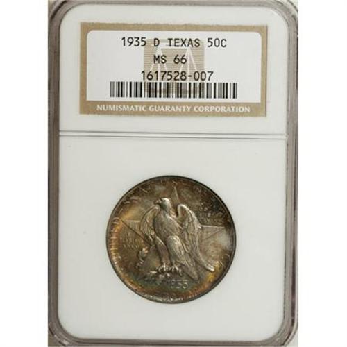 <B>1935-D 50C Texas MS66 NGC.</B></I> NGC Census: (624/181). PCGS Population (628/174). Mintage: 10,007. Numismedia Wsl. Price for NGC/PCGS coin in MS66: $380. (#9383)<BR><BR><b>Shipping:</b> Coins & Currency (<a target="_blank" href="http://www.heritageauctions.com/common/shipping.php">view shipping information</a>\)