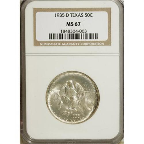 <B>1935-D 50C Texas MS67 NGC.</B></I> Well-defined and shining with surprising hints of frostiness on the reverse. Whispers of ice-blue and silver-gray patina visit carefully preserved and otherwise untoned surfaces.<BR><I>From The Silver Spur Collection.</B></I><BR><BR><b>Shipping:</b> Coins & Currency (<a target="_blank" href="http://www.heritageauctions.com/common/shipping.php">view shipping information</a>)