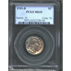 <TR><TD width="100%"><TABLE cellSpacing=1 cellPadding=3 width="100%" border=0><TBODY><TR><TD width="100%" bgColor=#79735c><FONT face=arial color=#ffffff size=3><B>Description</B> </FONT></TD></TR><TR><TD width="100%" bgColor=#ffffff><FONT face=arial size=2><B>1935-D 5C MS65 PCGS.</B></I> Honey-gold and steel-blue colors endow this lustrous and carefully preserved Gem. Although the strike is good, the peripheral legends are not crisp strictly due to the late die state. </FONT></TD></TR></TBODY></TABLE></TD></TR></TBODY></TABLE><BR><A name=PricesRealized></A><TABLE cellSpacing=0 cellPadding=0 width="100%" bgColor=#000000 border=0><TBODY><TR><TD width="100%"><TABLE cellSpacing=1 cellPadding=3 width="100%" border=0><TBODY><TR><TD width="100%" bgColor=#79735c><A name=PR><FONT face=arial color=#ffffff size=3><B>Previous Prices from Heritage Auctions</B> </FONT></A></TD></TR><TR><TD bgColor=#f6f6ed><TABLE cellSpacing=0 cellPadding=0 width="100%" border=1><TBODY><TR><TD align=middle width="33%"><B>Date</B></TD><TD align=middle width="33%"><B>Service</B></TD><TD align=middle width="33%"><B>Price</B></TD></TR><TR bgColor=whitesmoke><TD width="33%"><B>08/13/1996</B></TD><TD width="33%">PCGS</TD><TD width="33%">$231.00</TD></TR><TR bgColor=whitesmoke><TD width="33%"><B>05/27/2003</B></TD><TD width="33%">PCGS</TD><TD width="33%">$379.50</TD></TR><TR bgColor=whitesmoke><TD width="33%"><B>11/25/2002</B></TD><TD width="33%">NGC</TD><TD width="33%">$235.75</TD></TR><TR bgColor=whitesmoke><TD width="33%"><B>11/05/2002</B></TD><TD width="33%">NGC</TD><TD width="33%">$330.05</TD></TR><TR bgColor=whitesmoke><TD width="33%"><B>06/10/2002</B></TD><TD width="33%">NGC</TD><TD width="33%">$333.50</TD></TR><TR bgColor=whitesmoke><TD width="33%"><B>09/21/1996</B></TD><TD width="33%">NGC</TD><TD width="33%">$203.50</TD></TR><TR bgColor=whitesmoke><TD width="33%"><B>08/15/2000</B></TD><TD width="33%">NGC</TD><TD width="33%">$210.00</TD></TR><TR bgColor=whitesmoke><TD width="33%"><B>08/07/1998</B></TD><TD width="33%">NGC</TD><TD width="33%">$287.50</TD></TR><TR bgColor=whitesmoke><TD width="33%"><B>06/03/2003</B></TD><TD width="33%">NGC</TD><TD width="33%">$303.60</TD></TR><TR bgColor=whitesmoke><TD width="33%"><B>11/17/2001</B></TD><TD width="33%">ANACS</TD><TD width="33%">$207.00</TD></TR><TR bgColor=whitesmoke><TD width="33%"><B>10/01/2002</B></TD><TD width="33%">PCGS</TD><TD width="33%">$391.00</TD></TR><TR bgColor=whitesmoke><TD width="33%"><B>12/04/2001</B></TD><TD width="33%">PCGS</TD><TD width="33%">$340.00</TD></TR><TR bgColor=whitesmoke><TD width="33%"><B>11/17/2001</B></TD><TD width="33%">PCGS</TD><TD width="33%">$322.00</TD></TR><TR bgColor=whitesmoke><TD width="33%"><B>10/06/2001</B></TD><TD width="33%">PCGS</TD><TD width="33%">$345.00</TD></TR><TR bgColor=whitesmoke><TD width="33%"><B>05/06/1994</B></TD><TD width="33%">PCGS</TD><TD width="33%">$330.00</TD></TR><TR bgColor=whitesmoke><TD width="33%"><B>04/11/1997</B></TD><TD width="33%">PCGS</TD><TD width="33%">$209.00</TD></TR><TR bgColor=whitesmoke><TD width="33%"><B>02/02/1994</B></TD><TD width="33%">PCGS</TD><TD width="33%">$319.00</TD></TR><TR bgColor=whitesmoke><TD width="33%"><B>08/14/1999</B></TD><TD width="33%">ANACS</TD><TD width="33%">$253.00</TD></TR></TBODY></TABLE></TD></TR><TR><TD bgColor=#ffffff><FONT face=arial size=1 ?>PLEASE NOTE: All prices realized reflect the final hammer price PLUS the buyer's premium in auctions that charge a buyer's premium. Each item has a notation at the top of the listing indicating whether that lot included a buyer's premium. Example: A item that sells with a final hammer price of $100 and a 20% buyer's premium will display with a price realized of $120. All information listed is intended to be as accurate as possible, but errors are possible. Please use this guide carefully and inform us of any inaccuracies. </FONT></TD></TR></TBODY></TABLE></TD></TR></TBODY></TABLE><BR><TABLE cellSpacing=0 cellPadding=0 width="100%" bgColor=#000000 border=0><TBODY><TR><TD width="100%"><TABLE cellSpacing=1 cellPadding=3 width="100%" border=0><TBODY><TR><TD width="100%" bgColor=#79735c colSpan=6><FONT face=arial color=#ffffff size=3><B>Price Guide*</B> </FONT></TD></TR><TR bgColor=#f6f6ed><TD align=middle><B>Grade</B> </TD><TD align=middle><B>Coin World<BR>(Trends)</B> </TD><TD align=middle><B>Numismedia<BR>Retail</B> </TD><TD align=middle><B>Numismedia<BR>Wholesale</B> </TD><TD align=middle><B>Coin<BR>Universe</B> </TD><TD align=middle><B>Heritage<BR>Value Index</B> </TD></TR><TR bgColor=#ffffff><TD align=middle>64</TD><TD align=right>$120.00</TD><TD align=right>$145.00</TD><TD align=right>$116.00</TD><TD align=right>$110.00</TD><TD align=right>$84.50</TD></TR><TR style="FONT-WEIGHT: bold" bgColor=#cccfdd><TD align=middle>65</TD><TD align=right>$750.00</TD><TD align=right>$550.00</TD><TD align=right>$440.00</TD><TD align=right>$435.00</TD><TD align=right>$351.00</TD></TR><TR bgColor=#ffffff><TD align=middle>66</TD><TD align=right>$1,500.00</TD><TD align=right>---</TD><TD align=right>$975.00</TD><TD align=right>$1,250.00</TD><TD align=right>$913.33</TD></TR><TR bgColor=#ffffff><TD colSpan=6><FONT size=1>*All information listed is intended to be as accurate as possible, but errors are possible. No item may be returned or refused based on this information which is provided as a service to our customers. You should contact each pricing source directly to determine the accuracy of this information. </FONT></TD></TR></TBODY></TABLE></TD></TR></TBODY></TABLE><BR><TABLE cellSpacing=0 cellPadding=0 width="100%" bgColor=#000000 border=0><TBODY><TR><TD width="100%"><TABLE cellSpacing=1 cellPadding=3 width="100%" border=0><TBODY><TR><TD width="100%" bgColor=#79735c><FONT face=arial color=#ffffff size=3><B>Population Guide</B> </FONT></TD></TR><TR bgColor=#ffffff><TD align=middle><!-- Begin Output of Population Grid--><TABLE cellSpacing=0 cellPadding=0 width="100%" border=0><TBODY><TR><TD vAlign=center><TABLE cellSpacing=0 width="100%" bo