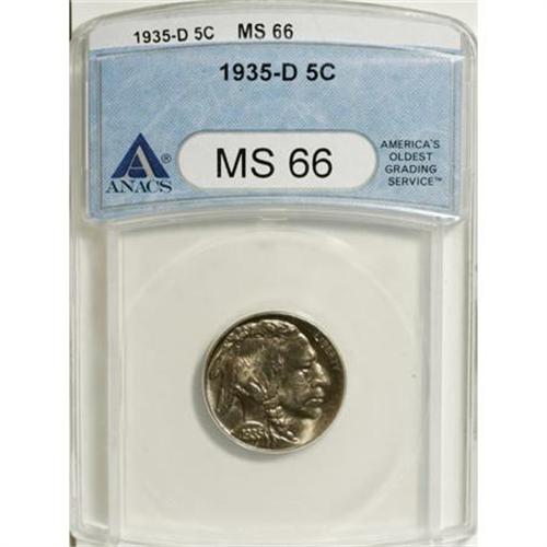 <B>1935-D/D 5C MS66 ANACS.</B></I> A secondary mintmark appears just to the west. This pleasingly detailed and shining gold-tinged Premium Gem comes from one of the more challenging later mintmarked Buffalo nickel issues. Well-preserved overall with a faint graze on the cheekbone.<BR><BR><B>Coin Engraver:</B> James E. Fraser<BR><BR><b>Shipping:</b> Coins & Currency (<a target="_blank" href="http://www.heritageauctions.com/common/shipping.php">view shipping information</a>)