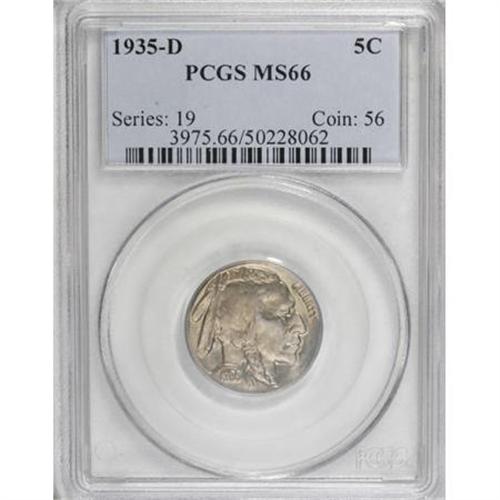 <B>1935-D 5C MS66 PCGS.</B></I> Rich gold toning with fully brilliant and highly lustrous surfaces. The 1935-D is a scarce Buffalo nickel that is always in demand. Just five finer examples have been certified by PCGS.<BR><BR><B>Coin Engraver:</B> James E. Fraser<BR><BR><b>Shipping:</b> Coins & Currency (<a target="_blank" href="http://www.heritageauctions.com/common/shipping.php">view shipping information</a>)