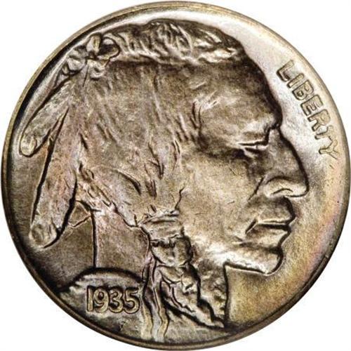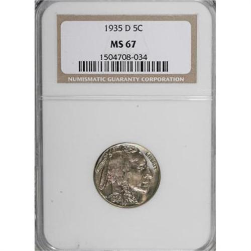 <B>1935-D 5C MS67 NGC.</B></I> David Lange (2006) writes that "Fully-struck Gems are genuinely rare. Many of these coins were struck from extremely worn dies ... ." An attentive strike brings out excellent definition on the Superb Gem in this lot, save for a touch of softness in the outer parts of some of the letters in LIBERTY. Impeccably preserved surfaces exhibit outstanding luster and pastel violet and gold patination. Census: 4 in 67, 0 finer (8/07).<BR><BR><B>Coin Engraver:</B> James E. Fraser<BR><BR><b>Shipping:</b> Coins & Currency (<a target="_blank" href="http://www.heritageauctions.com/common/shipping.php">view shipping information</a>)