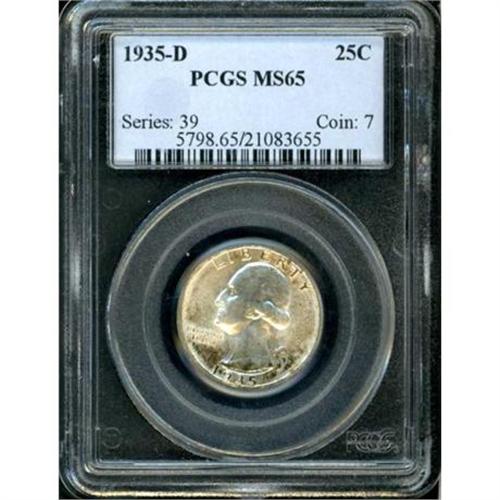 <b>1935-D Washington Quarter Dollar. PCGS graded MS65.</b> Another sharply struck, lustrous Gem of the 1935-D issue. Never considered common, the 1935-D has grown in appreciation of its scarcity with the advent of third-party grading <b>(PCGS # 5798)</b>